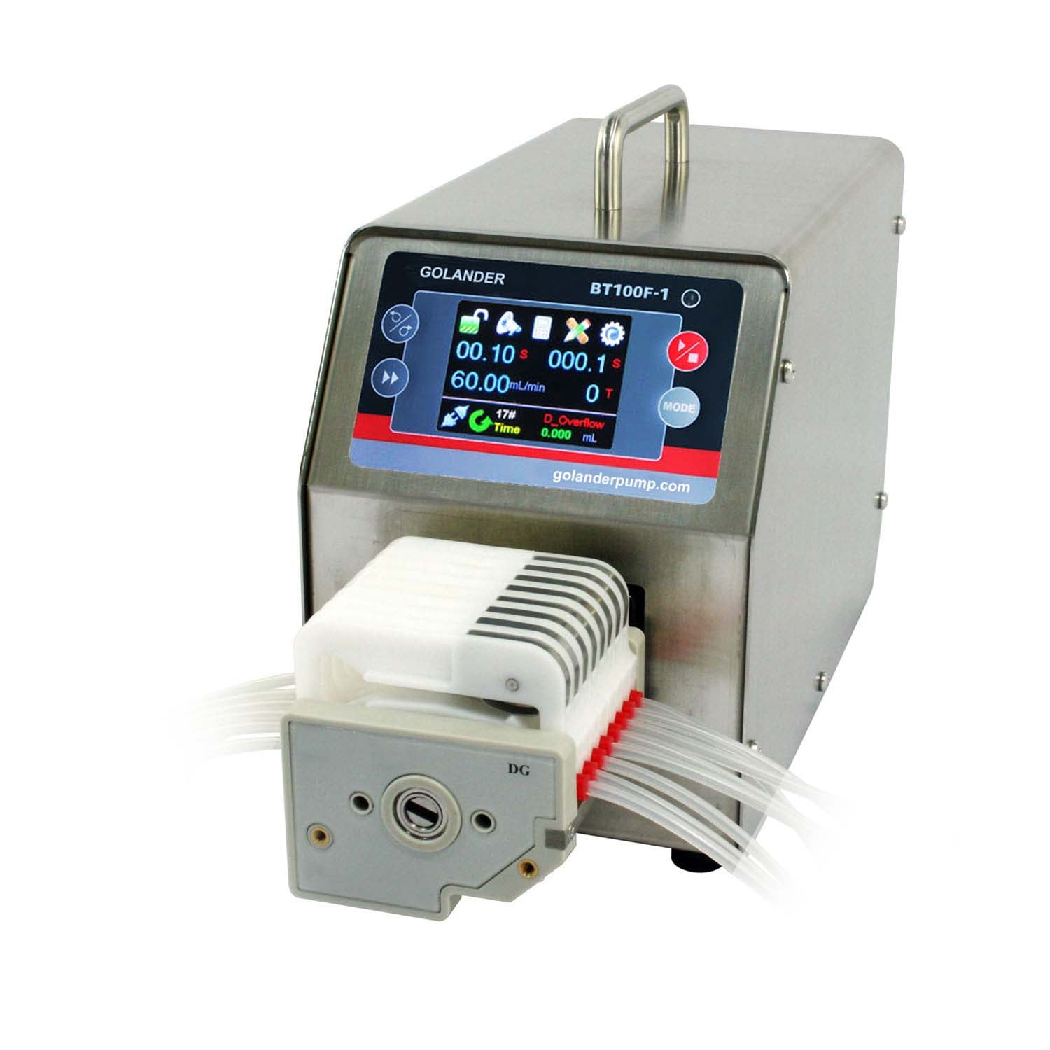 BT100F-1 intelligent dispensing peristaltic pump provides flow range from 0.00011 to 1700 mL/min with variable pump heads and tubing. The color LCD touch screen provides intuitive and clear displaying interface. There are four operation modes available: volume dispensing mode for high accuracy dispensing; time dispensing mode for high productive efficiency; copy dispensing mode for separating fluid to number of equal parts; flow mode is the same as intelligent flow peristaltic pump. Large torque output to work with more pump head combinations. Intelligent temperature control technology reduces working noise. With standard MODBUS RS485 interface, the pump is easy to communicate with external device, such as PC, HMI or PLC. Stainless steel housing is easy to clean and corrosion resistant.