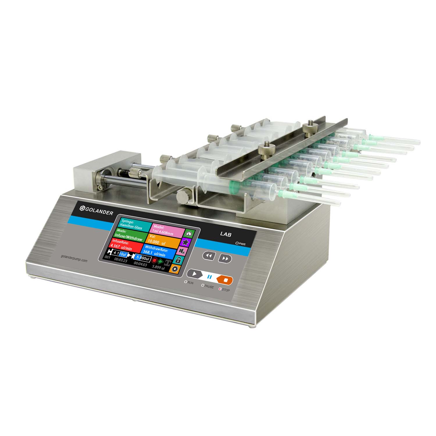The LAB-10 laboratory syringe pump features an integrated benchtop design, complete with a 5" HD LCD touchscreen for intuitive operation. This pump is capable of accommodating up to 10 syringes, offering versatility with a broad range of syringe volumes, spanning from 10 μL to 10 mL. Additionally, it provides precise control over flow rates, ranging from 0.184 nL/min to 24.520 mL/min.