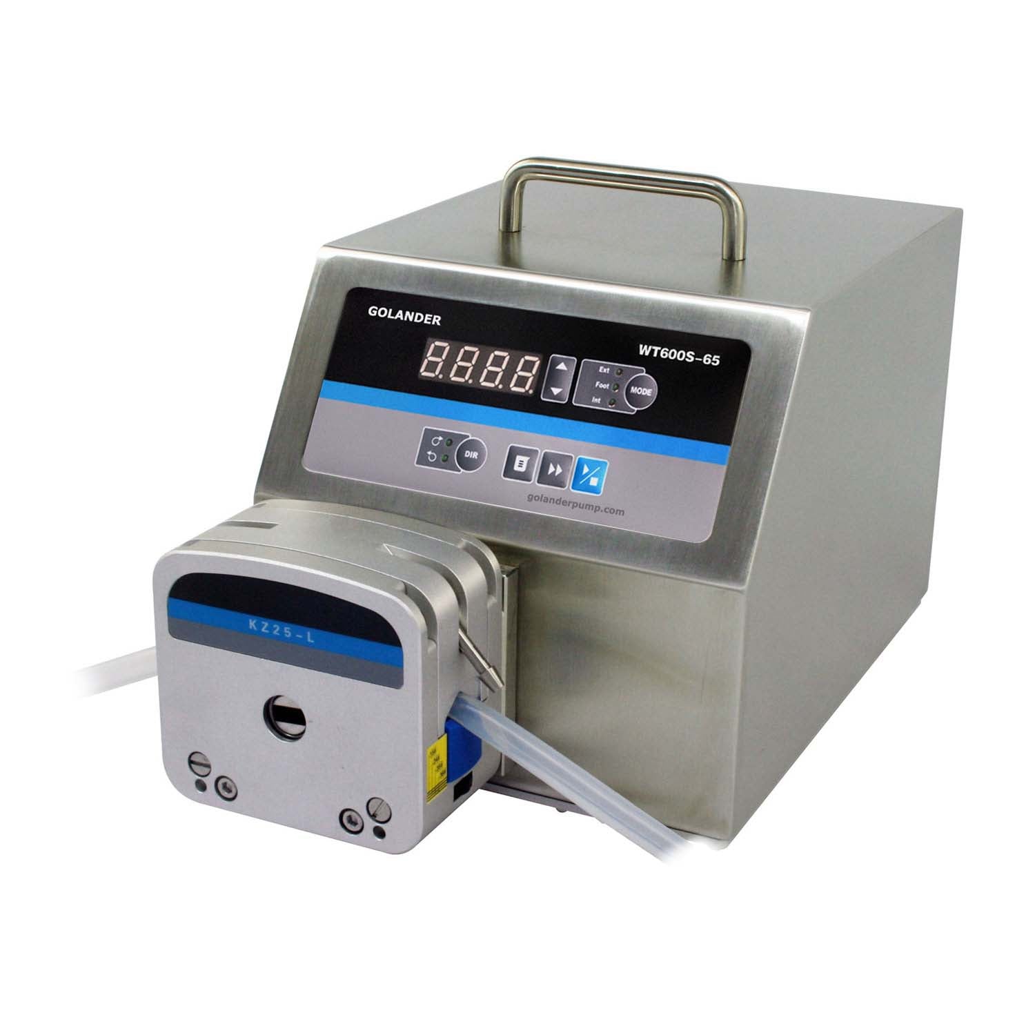 The IP65 waterproof grade WT600S-65 variable speed peristaltic pump provides flow rate from 3 to 6000mL/min. The high torque DC brushless motor drive is no maintenance required, and it can drive up to four pump heads. It has basic functions such as reversible direction, start/stop, full speed (for fast cleaning), adjustable speed. The basic dispensing function can easily repeat liquid dispensing by time. With MODBUS RS485 interface, the pump is easy to be controlled by external device, such as computer, human machine interface or PLC.